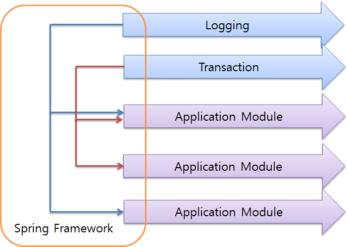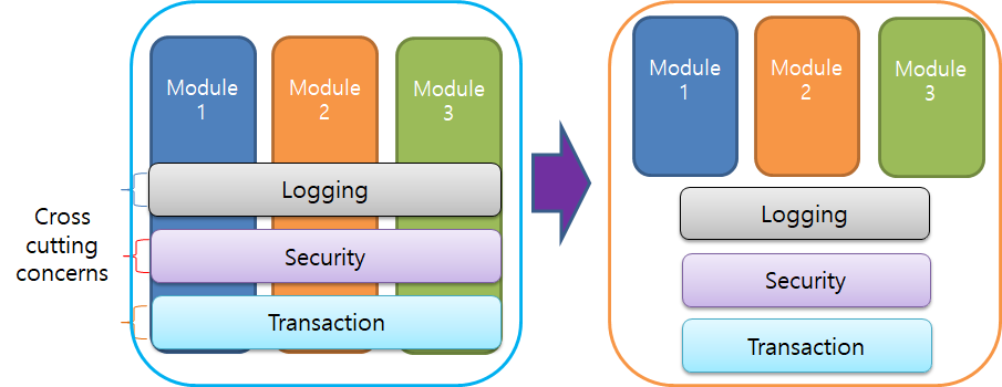 - AOP를 사용하면 여러 클래스에 영향을 미치는 기능을 재사용 가능한 모듈(즉, 측면)로 캡슐화할 수 있음