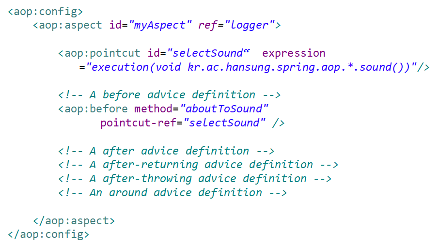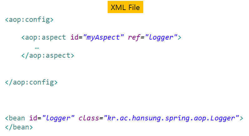 Aspect = 일반 Java 클래스 + XML 구성(config)