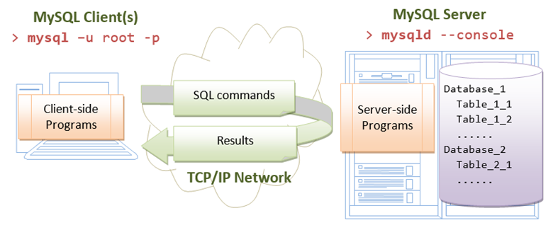 MySQL은 TCP/IP 네트워크를 통해 Client-Server 시스템으로 작동.